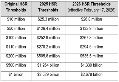 Pursuant to 15 U.S.C. § 18a, the HSR Act’s jurisdictional thresholds are adjusted annually to reflect changes in nominal (non-inflation-adjusted) gross national product (GNP). The 2026 thresholds reflect an approximately 5.9% increase from the 2025 thresholds. The new $133.9 million minimum size-of-transaction threshold is an increase of $7.5 million from the $126.4 million 2025 threshold.