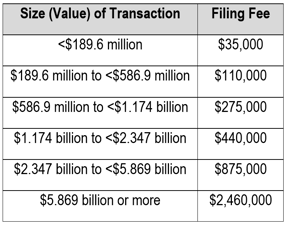 The six-tiered filing fee structure requires filing fees per transaction ranging from $35,000 (for transactions valued under $189.6 million) to $2.46 million (for transactions valued at $5.869 billion or more).